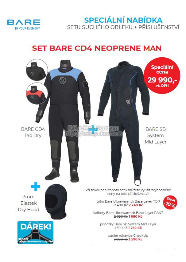 AKCE - DIVELOCAL 2022 - aneb podporujeme suché potápění. V rámci této speciální akce značek URSUIT a BARE jsme pro Vás připravili zvýhodněné balíčky se suchými obleky, podobleky a doplňky. Při objednávce tohoto setu si do poznámky dejte velikosti a případný výběr dalších doplňku dle voleb, barevných variant a velikostí v textu. Veškeré detaily s Vámi doladíme k Vaši plnné spokojenosti a komfortnímu padnutí celé sestavy.POZNÁMKA - neplaťte prosím tedy objednávku předem bankovním převodem ani kartou. Po přesné specifikaci a doladění všech doplňků vám bude zaslána následně kompletní výzva k platbě za celou Vaši objednávku! Děkujeme.BARE CD4 Pro Dry „Skvělý oblek z hyperkomprimovaného neoprenu“ Oblek vhodný pro začátečníka nebo každého, komu bývá zima. Komprimovaný neopren Vás skvěle ochrání proti chladu i rozdílu tlaků na různých hloubkách. Vysoce hodnotný oblek se zadním zipem pro snadné oblékání.