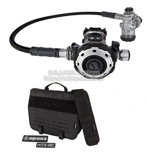 Regulátory MTX byly zkonstruovány podle striktních požadavků vojenských potápěčů. Jsou jednoduché, robustní, odolné a připravené pro potápění v jakýchkoli podmínkách, včetně extrémně studené vody. Regulátor MTX-RC má všechny vlastnosti platformy MTX. Navíc je vybaven pro Apeks obvyklými ovládacími prvky - přepínačem Venturiho efektu a šroubem pro plynulou regulaci nádechového odporu. Není tedy tak přímočaře jednoduchý jako model MTX-R. Dává ale svému uživateli možnost pružně reagovat na různé podmínky při potápění a vyladit svůj regulátor vždy na optimální výkon. Odolnost a výdrž Všechny regulátory MTX mají velmi pevnou konstrukci. Na okrajových plochách, hranách a dalších exponovaných místech jsou chráněny pružnými nárazníky a zesílenými materiály. Extrémně studená voda 1. stupně MTX mají celokovové tělo s maximalizací povrchu. Jsou izolovány suchou komorou uzavřenou unikátním krytem s integrovanou membránou, která odolává pokrytí ledem i při velmi vysokých průtocích v extrémně studené vodě. 2. stupně MTX mají v předním krytu zabudován kovový plát a masivní tepelný výměník obepínající oblast kolem sedla. Všestrannost 1. stupně MTX mají 4 MP porty na otočné hlavě a 1 axiální MP port. 2. stupně MTX jsou vybaveny systémem DCE - uživatelsky vyměnitelné výdechové deflektory (krátké / dlouhé) a systémem RVS - lze je sestavit s připojením hadice z pravé nebo z levé strany. 1. stupeň MTX-RCKované mosazné tělo s povrchovou úpravou satin chrom Maximalizace povrchu pomocí žebrování pro co nejefektivnější výměnu tepla Inovativní uzavření 1. stupně chránící regulátor před nárazy Tepelný výměník v okolí suché komory Over-balanced membránová konstrukce 5 x LP port (4 x na otočné hlavě, 1 x axiální) 2 x HP port na nakloněných plochách Robustní celokovové DIN točítko Připojení: DIN 300 bar, M26 300 bar (O2) Hmotnost (verze DIN 300 bar): 760 g Certifikace EN250A 2. stupeň MTX-RC Nárazníky a zesílené materiály na nejvíce exponovaných místech Ergonomický ovladač Venturiho efektu Robustní ovladač nádechového odporu Pro snadnou manipulaci i v silných rukavicích Tvrdý přední kryt se zabudovaným kovovým plátem Velké tlačítko sprchy Masivní tepelný výměník Otočný 2. stupeň pro konfigurace s připojením hadice z levé nebo z pravé strany Dva typy uživatelsky vyměnitelných deflektorů Náústek COMFO-BITE Hmotnost: 288 g Certifikace EN250A Hadice 1 x FLEXI černá 0,75m 3/8"UNF DOUBLE SWIVEL Příslušenství 1 x brašna na regulátor MTX-RC