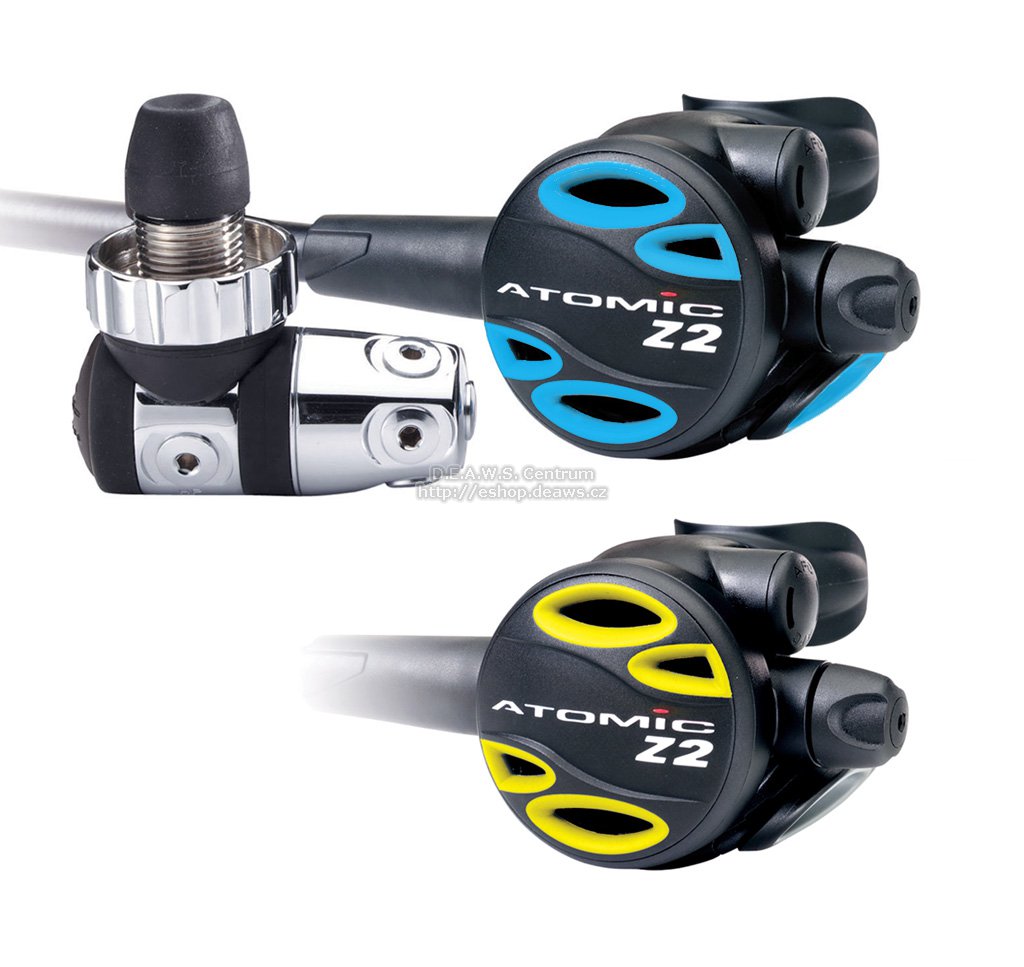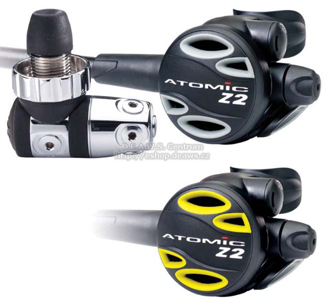Z2 1.st Nerezové díly 2. st. z materiálu titan/zirconium. 7 pevných LP portů. Firmou Atomic patentovaný "Seat Saving Orifice" - omezovač přítlaku sedla. Exkluzivní "Jet Seat" - větší průměr pístu a sedel jsou nespornou výhodou z hlediska bezpečnosti provozu v extrémně chladných vodách. Patentovaná "Automatic Flow Control" - AFC - pro největší výkon v každé hloubce. Možnost použití Nitroxu až do 40%. Limitovaná životní záruka (30 let). Stejný výkon dýchání jako u T1 a B2, ale s kompaktnějším 1. stupněm a 7 výstupy. 2. stupeň má stejné vlastnosti jako modely T1 a B2, jen je s bronzovým poproudým ventilem pokoveným směsí zirconia a palladia, která signifikantně zvyšuje jeho odolnost proti korozi. Z2 2.st Patentovaná "AFC" - pro zajištění největšího výkonu v každé hloubce. Vyvážený. Kovové díly jsou chráněny zirconiem. Pružinka a páčka jsou vyrobeny z titanu. Anatomický, ortodontický náustek z dvojitého silikonu. Černá LP hadice ke 2.st. Z2 Octopus Klíčové komponenty dávkovacího mechanismu octopusu Z2 jsou z Titanu a nerezové oceli třídy 316, aby byla zaručena korozivzdornost. Těleso dávkovacího ventilu je vyrobeno z mosazi a pokoveno Zirkoniem, které svou tvrdostí výrazně překonává běžné chromování. Černá LP hadice ke 2.st (92cm).