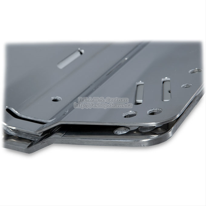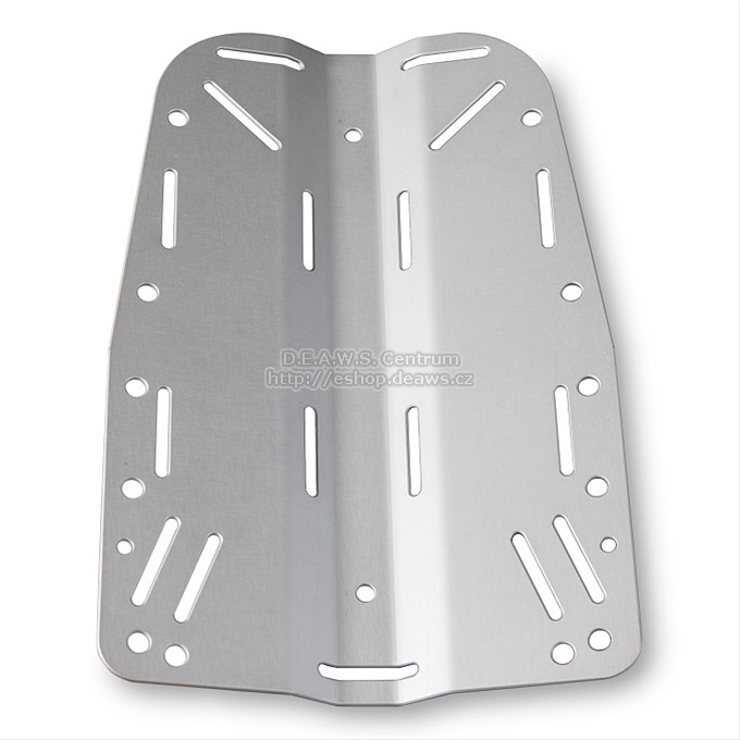 Nerez 3mm: Standardní zádová deska z leštěného nerezu se standardními rozměry (zejména roztečí otvorů pro připojení dvojčete). Nabízená deska je základním kamenem celé stavebnice potápěčské výstroje a lze ji použít pro úplný rozsah potápění - od dovolenkového rekreačního odpočívaní v teplých mořích až po extrémní ponory do jeskyní nebo na hluboké vraky. Otvory v desce jsou navrženy tak, aby umožňovaly různu variabilitu výstroje. Deska je vybavena svislými prořezy, umožňujícími připevnění láhve.