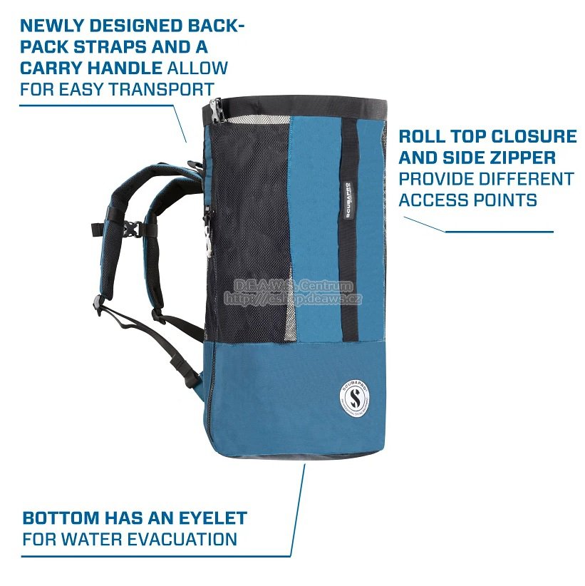 Batoh na záda do kterého se vejde celá ABC výbava (masky, šnorchly, ploutve atd.) pro celou rodinu. Je opatřen ramenním popruhem na pohodlné nošení na zádech. Velká část batohu je vyrobena z pevné síťoviny, batoh je tak velmi prodyšný, lehký ale přesto pevný. Batoh velmi oceníte na rodinné dovolené kdy budete přenášet svoji výstroj na šnorchlování pro celou rodinu. Batoh je dostatečně velký, vejdou se do něho i velké nazouvací ploutve.Rolovací otvor umožňuje snadný přístup a zajišťuje bezpečné uzavření. Boční zip umožňuje přístup k obsahu, i když je rolovací otvor zavřený. Tech. data: Ideální příruční zavazadlo pro šnorchlovací potřeby nebo potápěčské vybavení do tropických vod. Je vyrobena z kombinace síťoviny a nové denim tkaniny s černou vnitřní podšívkou s logem SCUBAPRO. Pro přístup do vnitřního prostroru lze využit buď rolovací horní uzávěr nebo boční zip. Přední kapsa na zip je ideální pro uložení menších předmětů. Nově navržené popruhy batohu a rukojeť pro přenášení umožňují snadnou přepravu. Odolná tkanina na dně je opatřena otvorem pro odvod vody. Materiál: 600 Denier Polyester/PU. Hmotnost: 0,67kg. Přibližné rozměry: 700 x 300 x 280 mm. Objem: 65 lit.