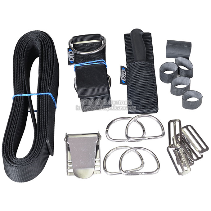 Sestava pevného kompletu obsahuje: PA popruh šíře 50mm a délky 3,8m, Nerezové D-kroužky. Nerezové stopky. Nerezovou opaskovou sponu. DTD nůž s pouzdrem. Nastavitelný mezinožní popruh. Gumy pro zajištění záložních světel.