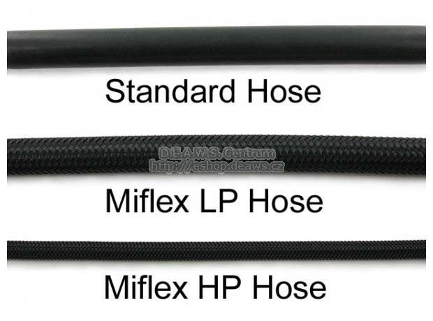 Vlastnosti a výhody MIFLEX hadic: Průměrná životnost je 3x delší než u běžných gumových hadic. O více než 30% lehčí než gumové hadice. Extrémně flexibilní. Vynikající odolnost proti proražení, oděru a UV. Několikrát vyšší tlaková odolnost než u běžných LP hadic. Více než 30 bezpečnostních testů na každou hadici. Standardní LP závit 3/8" UNF.