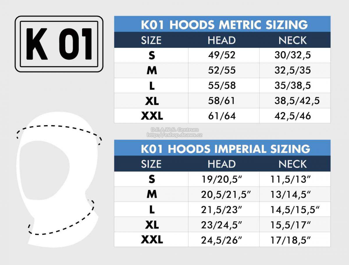 Haubny K 01 jsou k dispozici v tloušťkách neoprénu 3 a 5 a 8 mm. Tech. data: Špičkový neoprén vyráběný v Japonsku. Ruční návrh, střih i šití probíhá v italské dílně. Velikosti jsou standardní S až XXL. - volba viz. obrázek velikostní tabulky! Fantasticky pohodlná, padnoucí a měkká haubna pro ty nejnáročnější rekreační i technické potápěče.
