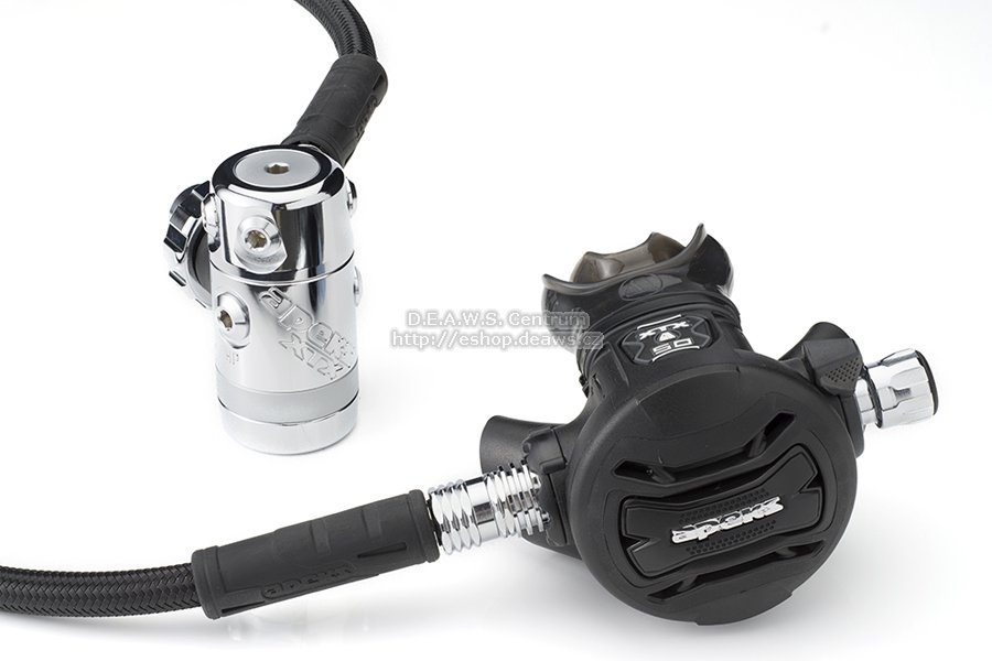 První stupeň DST je membránový vyvážený, uzavřený membránou (Dry Sealed - DS). Okolní voda neproniká do vnitřních částí prvního stupně a ten je tak chráněn proti kontaminaci a zamrzání. Čtyři středotlaké 3/8"UNF výstupy a dva vysokotlaké 7/16"UNF jsou umístěny na tělě prvního stupně. Druhý stupeň XTX50 lze díky systému RVS používat jako levostranný nebo pravostranný. Jednoduchou přestavbu provede každý servisní technik Apeks. V základní výbavě XTX50 jsou dva typy výdechového deflektoru (malý a velký). Jejich záměna je velmi jednoduchou operací, kterou zvládne každý z vás běhěm chvilky. XTX50 je vybaven tepelným výměníkem. Nádechový odpor lze plynule regulovat pomocí šroubu. Nový silikonový výdechový ventil zlepšuje komfort dýchání.