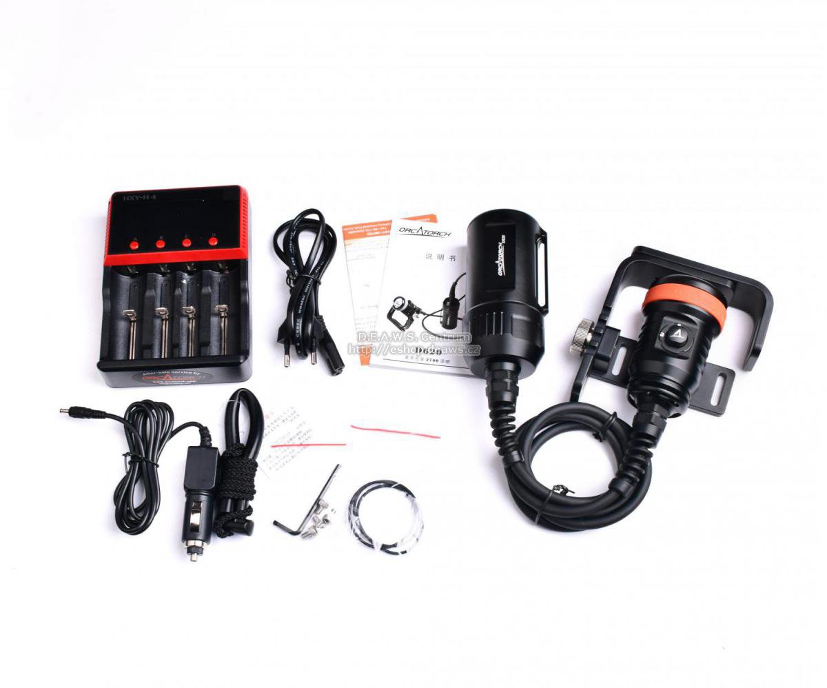 Kanystr D620 od OrcaTorch je primární potápěčské světlo speciálně určené pro potápění a potápění v jeskyních. Nově navržený spínač lze při otočení o 90 stupňů zablokovat, což nejenom nabízí snadné a spolehlivé ovládání, ale také zabraňuje náhodnému zapnutí světla. Přiložená snadno nastavitelná ruční otočná rukojeť je snadno sestavitelná. Světlo využívá 4 ks 18650 baterií a má maximální výkon 2700 lumenů, což z něj činí velmi užitečný nástroj pro uspokojení vašich potřeb pod vodou. Tech. data: LED Cree XHP70, výstup 2700 lumenů Čtyři Li-ion baterie 18650 Výdrž: v max. režimu 2h 30min, střed 8h 50min, v min. režimu 37h Otočný uzamykatelný spínač 90 ° nabízí snadný a spolehlivý provoz Nastavitelná otočná rukojeť s dobrou manipulací Konstrukce odolná proti tlaku vody, hloubka je 150 metrů Ochrana proti přehřátí Ochrana proti přepólování, aby se zabránilo nesprávné instalaci baterie Ochrana proti výboji Hliníkový materiál Nejnovější tvrdě eloxovaná povrchová úprava diamantem - odolnost proti korozi a mořské vodě Hliníkový reflektor ze slitiny s profesionální optickou analýzou Dvojité tvrzené sklo Délka kabelu: 110 cm
