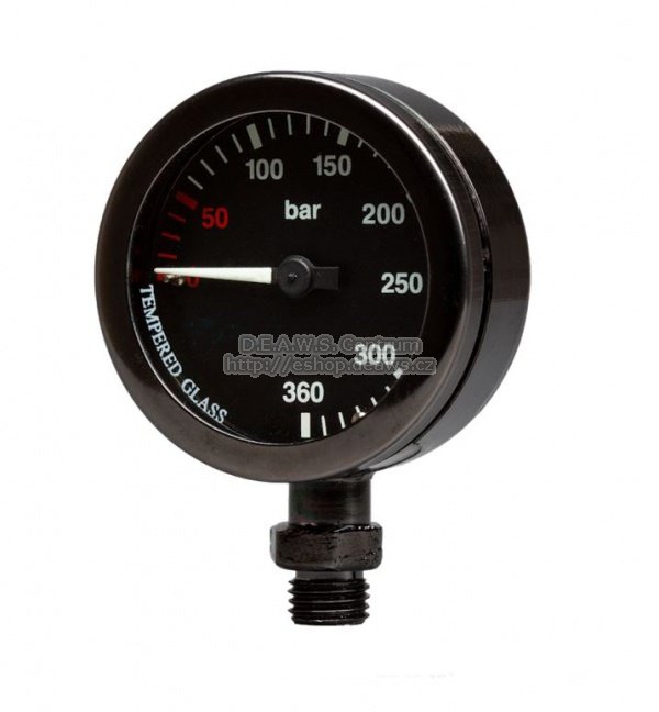 Manometr 300Bar s černou stupnicí a černým tělem. Vysoce kvalitní manometr je vyroben z mosazi potažené černým chromem PVD. Tato povrchovvá úprava je 300x tvrdší než běžné niklování. Přehledná stupnice do 300Bar je kryta tvrzeným sklem, které je odolné proti poškrábání. Manometr je vhodný pro použití k hlavním i stage automatikám. Manometr se prodává včetně osičky k hadici. Průměr 52mm V noci, ve vraku, jeskyňi atd. na něj vždy výborně uvidíte. Mít přehled o svém stavu plynu je v potápění to nejdůležitější! K produktu doporučujeme
