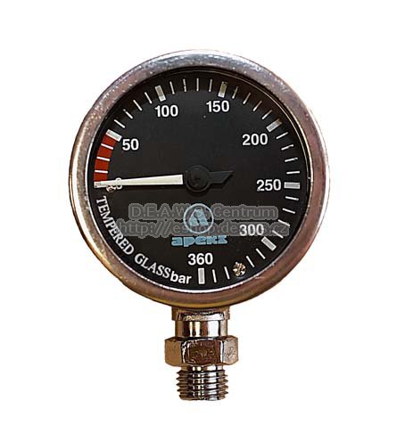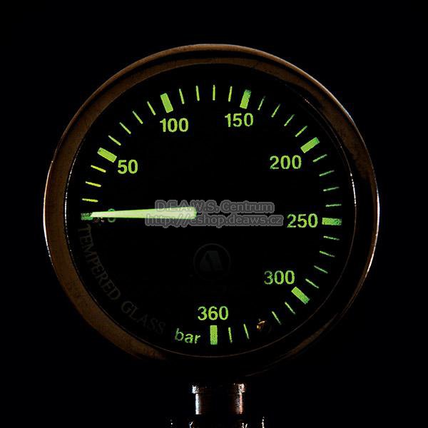 Kvalitní kovový manometr přímo od firmy APEKS s černou stupnicí a tělem z niklované mosazi. Tvrzené minerální sklo, pracovní tlak 300Bar. Manometr se prodává včetně osičky k hadici. Průměr 52mm. V noci, ve vraku, jeskyňi atd. na něj vždy výborně uvidíte. Mít přehled o svém stavu plynu je v potápění to nejdůležitější!