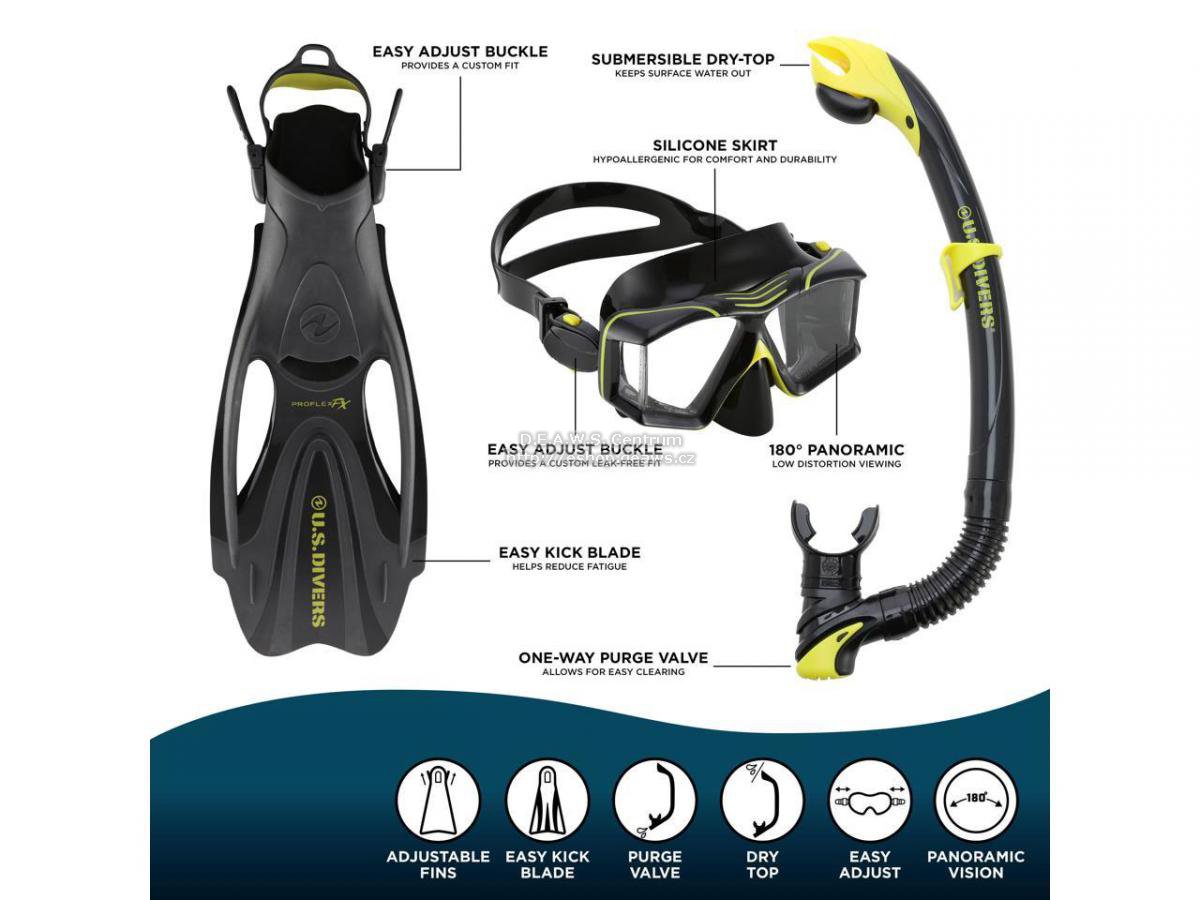 Tech. data: Set masky, šnorchlu a ploutví. Hypoalergenní silikonová lícnice zajišťuje dokonalou těsnost a je bezpečná pro vaši pokožku. Konstrukce se čtyřmi skly nabízí výjimečný 180° výhled. Silikonový náustek snižuje únavu čelistí, která je běžná u většiny šnorchlařů. Jednosměrný výdechový ventil umožňuje snadné vyfouknutí vody ze šnorchlu Klapka ve vrchní části šnorchlu zabraňuje vniknutí vody do šnorchlu při krátkých ponorech. Plně ohebná část šnorchlu vám zajistí pohodlí pro snadnou navigaci pod vodou a při nepoužívání se dá odklopit. Součástí této sady je taška (s popruhem přes rameno), na ABC vybavení pro přenášení,což je ideální na cesty. Ploutve s otevřenou patou a páskem pro upravení velikosti.