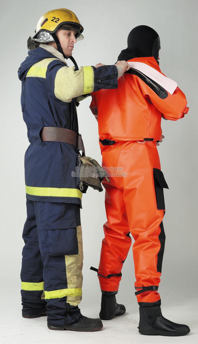 Výbava na přání: Kapsa na nůž upevněna na levém nebo pravém rukávě. Kapsa může být na přání zákazníka vyrobena podle velikosti jeho vlastního nože. Speciální poutka pro usnadnění oblékání obleku. Tato poutka mají veliký význam v případě, kdy je oblek navlékán ve stísněných prostorách, jako např. v lodi nebo požárním autě. Oblek může být také vybaven integrovaným jacketem / plovací vestou s nafukovacím napouštěcím ventilem. Pomocí těchto zařízení může být podle potřeby upravován vztlak. Tento ochranný design je často používán potápěči - záchranáři a pozemními záchranáři. V případě použití obleku pro pozemní záchranáře mohou být napouštěcí a vypouštěcí ventily vynechány. Zabudovaný pás s D-kroužky: k upevnění nástrojů a dalších zařízení, které je potřeba nosit u sebe. Může jej být použito k upevnění záchranného lana. Stehenní kapsa: buď polyurethanem potažený nylon nebo materiál daného obleku. Na obrázku je zobrazena nylonová kapsa. Kapsa na svítilnu, připevněná k levému nebo pravému rukávu. Kapsa může být na přání zákazníka vyrobena podle velikosti jeho vlastní svítilny. Na obrázku je zobrazena kapsa navržena na UK 4 AA svítilnu + záložní svítilnu. CE - typ schválení Heavy Light obleky jsou schválené podle CE normy v kategorii III, která je nejnáročnější kategorií.
