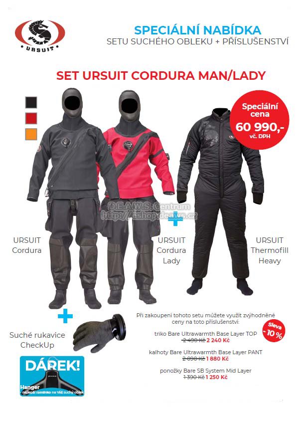 AKCE - DIVELOCAL 2022 - aneb podporujeme suché potápění. V rámci této speciální akce značek URSUIT a BARE jsme pro Vás připravili zvýhodněné balíčky se suchými obleky, podobleky a doplňky. Při objednávce tohoto setu si do poznámky dejte velikosti a případný výběr dalších doplňku dle voleb, barevných variant a velikostí v textu. Veškeré detaily s Vámi doladíme k Vaši plnné spokojenosti a komfortnímu padnutí celé sestavy.POZNÁMKA - neplaťte prosím tedy objednávku předem bankovním převodem ani kartou. Po přesné specifikaci a doladění všech doplňků vám bude zaslána následně kompletní výzva k platbě za celou Vaši objednávku! Děkujeme.URSUIT Cordura / Cordura Lady Odolnost proti abrazi nadevše! Jeskyně, vraky, řeky a hloubky vyžadují zvýšený pocit bezpečí. Suché obleky URSUIT z materiálu CORDURA byly vyvinuty na základě požadavku na extrémně odolný oblek vhodný do každých podmínek. Díky vysoce odolnému materiálu, se obleky staly ideální volbou pro technické i vrakové potápěče. Tyto obleky jsou vyrobeny z vysoce odolného třívrstvého materiálu Cordura. Kromě své robustnosti poskytují prvotřídní ergonomii a pohodlí. A mimo to skvěle vypadají