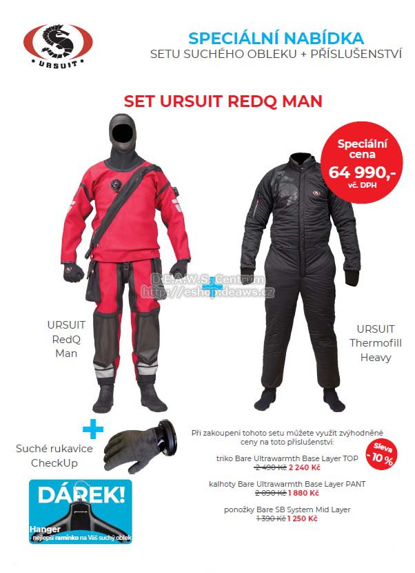 AKCE - DIVELOCAL 2022 - aneb podporujeme suché potápění. V rámci této speciální akce značek URSUIT a BARE jsme pro Vás připravili zvýhodněné balíčky se suchými obleky, podobleky a doplňky. Při objednávce tohoto setu si do poznámky dejte velikosti a případný výběr dalších doplňku dle voleb, barevných variant a velikostí v textu. Veškeré detaily s Vámi doladíme k Vaši plnné spokojenosti a komfortnímu padnutí celé sestavy.POZNÁMKA - neplaťte prosím tedy objednávku předem bankovním převodem ani kartou. Po přesné specifikaci a doladění všech doplňků vám bude zaslána následně kompletní výzva k platbě za celou Vaši objednávku! Děkujeme.URSUIT RedQ Man Odolnost proti abrazi nadevše! Jeskyně, vraky, řeky a hloubky vyžadují zvýšený pocit bezpečí. Suché obleky URSUIT z materiálu CORDURA byly vyvinuty na základě požadavku na extrémně odolný oblek vhodný do každých podmínek. Díky vysoce odolnému materiálu, se obleky staly ideální volbou pro technické i vrakové potápěče. Tyto obleky jsou vyrobeny z vysoce odolného třívrstvého materiálu Cordura. Kromě své robustnosti poskytují prvotřídní ergonomii a pohodlí. A mimo to skvěle vypadají Tech. data: Vysoce odolný materiál Cordura Výztuhy na kolenou a loktech pro větší odolnost Integrovaná kukla s oboustranně hladkou lícnicí Teleskopické torso Prostorné kapsy Přední kovový zip Neoprenové boty HD Latexové manžety na zápěstí a krku Reflexní prvky na rukou a nohou Barva: Red Velikosti: Man: XS, S, M, L, XL, 2XL, 3XL (SShort, MShort, LShort, XLShort, 2XLShort, 3XLShort), (STall, MTall, LTall, XLTall, 2XLTall) +