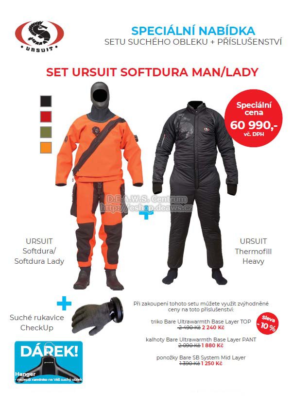 AKCE - DIVELOCAL 2022 - aneb podporujeme suché potápění. V rámci této speciální akce značek URSUIT a BARE jsme pro Vás připravili zvýhodněné balíčky se suchými obleky, podobleky a doplňky. Při objednávce tohoto setu si do poznámky dejte velikosti a případný výběr dalších doplňku dle voleb, barevných variant a velikostí v textu. Veškeré detaily s Vámi doladíme k Vaši plnné spokojenosti a komfortnímu padnutí celé sestavy.POZNÁMKA - neplaťte prosím tedy objednávku předem bankovním převodem ani kartou. Po přesné specifikaci a doladění všech doplňků vám bude zaslána následně kompletní výzva k platbě za celou Vaši objednávku! Děkujeme.URSUIT Softdura / Softdura Lady Odolnější než trilaminát, lehčí než Cordura. Elegantní a stylový. MADE IN FINLAND. Více barevných variant, které lze navíc vždy kombinovat s černým spodkem obleku.Ursuit Softdura je vyvinutý k maximálnímu pohodní při častém technickém potápění, které zahrnuje i vrakové a jeskynní využití. Oblek je vyroben z vysoce odolného třívrstvého materiálu, který je pružný a pohodlný ve všech situacích. Ergonomie oblekubyla řešena tak, aby byl oblek ideálně přizpůsobený pro delší ponory. Ursuit Softdura uspokojí potřeby každého náročného potápěče!