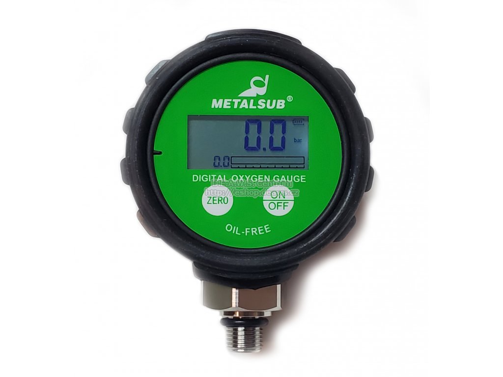 Digitální kyslíkový manometr pro měření tlaku v O2 lahvi a vhodný též pro přesné přepouštění O2. Ochranný gumový kryt. Tech. data: Závit: G1/4" Rozsah: 0-400 bar Třída přesnosti: 0.25% Pracovní teplota: -10C - 80C Napájení: 9V baterie Displej: LCD/podsvícený Ochranný gumový kryt.