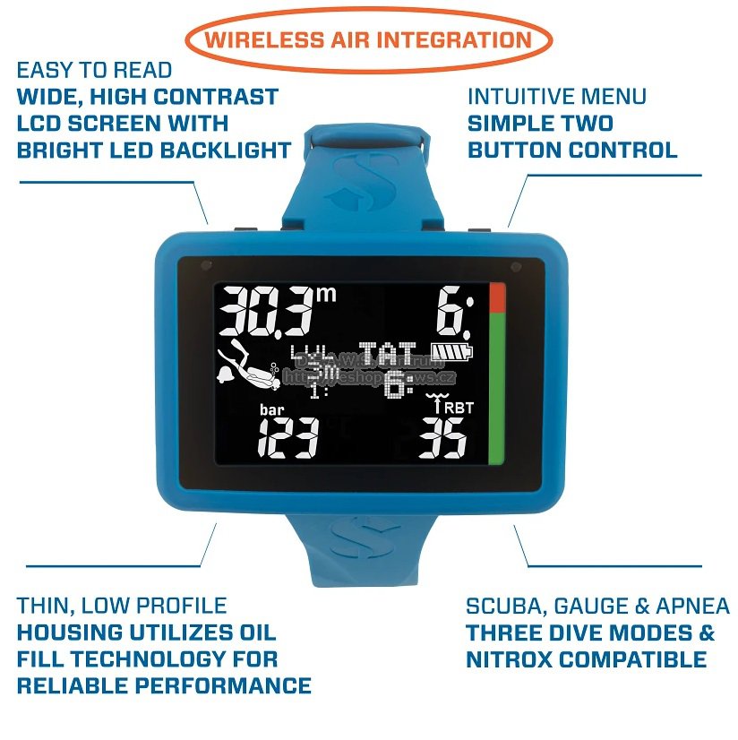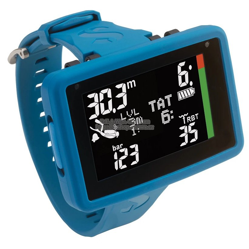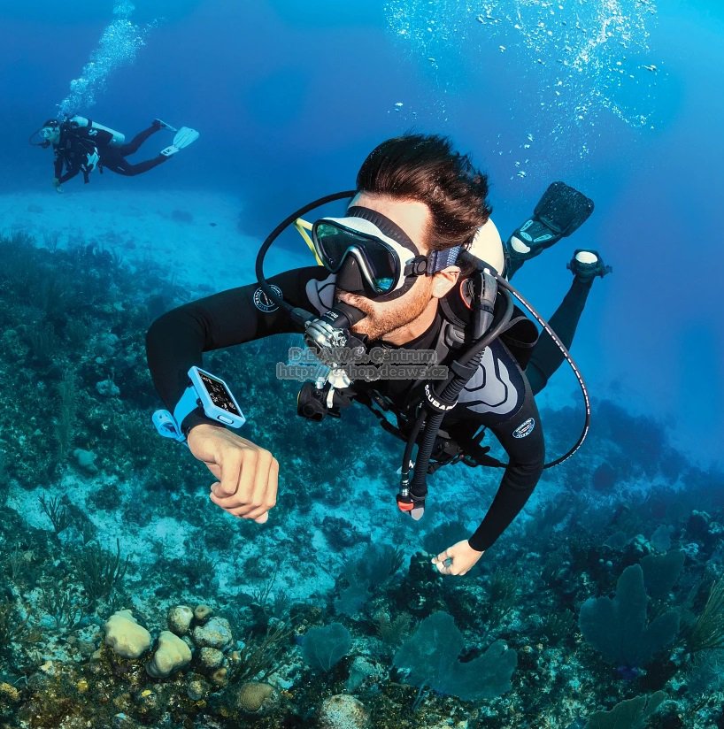 Tech. data: Široký, vysoce kontrastní černobílý LCD displej s velkými znaky a jasným LED podsvícením. Tenké termoplastové pouzdro využívá technologii olejové náplně pro spolehlivý chod. Jednoduché ovládání dvěma tlačítky: Intuitivní menu a ovládání usnadňují obsluhu. Výběr ze 2 algoritmů: Prediktivní víceplynový Buhlmann ZH-L16 ADT MB nebo ZH-L16+GF (Gradient Factor). Tři režimy a kompatibilita s Nitroxem: Dive, Gauge a Apnea mod. Kompatibilní s Nitroxem (100%) se 3 volitelnými plyny. PDIS (Profile dependant intermediate stops): Vypočítává mezizastávky na základě zatížení N2 u aktuálních a předchozích ponorů a dýchacích směsí pro bezpečnější potápění. Šest úrovní mikrobublin (L0-L5) umožňuje nastavit úroveň konzervativnosti algoritmu ADT tak, aby odpovídala vaší úrovni zkušeností, věku a fyzické kondici. Bluetooth® LE: Umožňuje stahovat ponory do jakéhokoli zařízení se systémem iOS nebo Android nebo do počítače PC/Mac. Firmware lze uživatelsky aktualizovat. Počítač je nově vybaven měkkým modrým silikonovým páskem s nerezovou sponou. Součástí je předinstalovaný černý silikonový kryt pouzdra a ochraná folie na obrazovce. Uživatelsky vyměnitelná baterie CR2450 je dimenzována až na dva roky/300 ponorů. Alternativní způsob uchycení pomocí bungee. Otvory jsou k dispozici na rohu pouzdra. Maximální provozní hloubka: 120m. MOŽNOST POZDĚJŠÍHO DOKOUPENÍ TLAKOVÉHO ČIDLA