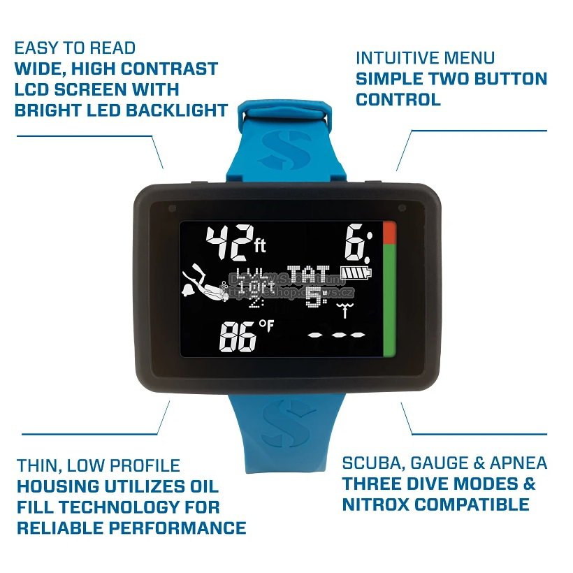 Tech. data: Široký, vysoce kontrastní černobílý LCD displej s velkými znaky a jasným LED podsvícením. Tenké termoplastové pouzdro využívá technologii olejové náplně pro spolehlivý chod. Jednoduché ovládání dvěma tlačítky: Intuitivní menu a ovládání usnadňují obsluhu. Výběr ze 2 algoritmů: Prediktivní víceplynový Buhlmann ZH-L16 ADT MB nebo ZH-L16+GF (Gradient Factor). Tři režimy a kompatibilita s Nitroxem: Dive, Gauge a Apnea mod. Kompatibilní s Nitroxem (100%) se 3 volitelnými plyny. PDIS (Profile dependant intermediate stops): Vypočítává mezizastávky na základě zatížení N2 u aktuálních a předchozích ponorů a dýchacích směsí pro bezpečnější potápění. Šest úrovní mikrobublin (L0-L5) umožňuje nastavit úroveň konzervativnosti algoritmu ADT tak, aby odpovídala vaší úrovni zkušeností, věku a fyzické kondici. Bluetooth® LE: Umožňuje stahovat ponory do jakéhokoli zařízení se systémem iOS nebo Android nebo do počítače PC/Mac. Firmware lze uživatelsky aktualizovat. Počítač je nově vybaven měkkým modrým silikonovým páskem s nerezovou sponou. Součástí je předinstalovaný černý silikonový kryt pouzdra a ochraná folie na obrazovce. Uživatelsky vyměnitelná baterie CR2450 je dimenzována až na dva roky/300 ponorů. Alternativní způsob uchycení pomocí bungee. Otvory jsou k dispozici na rohu pouzdra. Maximální provozní hloubka: 120m.