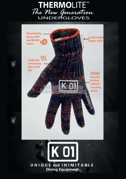 Podprádlové rukavice THERMOlite jsou pletené tak, aby byly pohodlné jako druhá kůže a absolutně neomezovaly pohyb a cit v suchých rukavicích. Výborné při potápění v chladných vodách se zárukou teplých a suchých rukou.. Výborné zpracování a špičková kvalita firmy K-01! Základní vrstva rukavic THERMOlite určených pod suché rukavice Pohodlné prodloužené zápěstí pro překrytí vnitřní manžety suchého obleku. Malé paprsky spojující rukavice s vrchní rukavicí pro příjemný hmat a konstantni výměnu plynu mezi vrstvami. Vanisové pletení absolutně beze švů, které dáva ruce fantastický pocit a uvolněnost Kvalita provedení a inovace z rukavic dělají unikátní technologii, která vám v ledové vodě zaruří ruce teplé a suché. Fotogalerie: K produktu doporučujemeZeptejte se nás