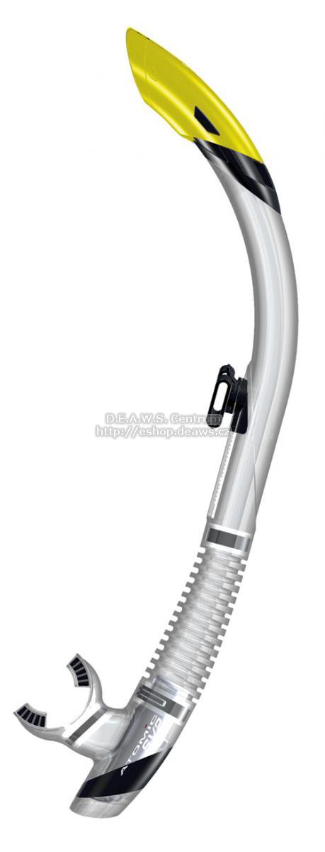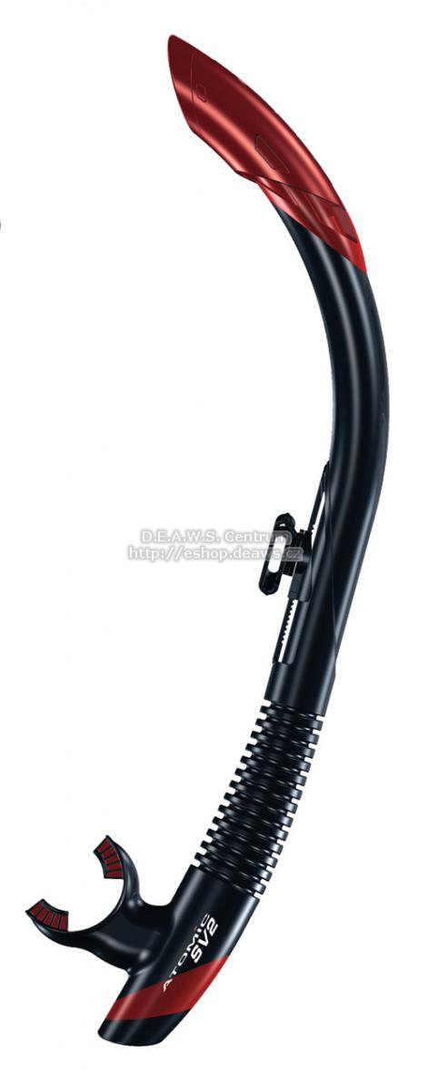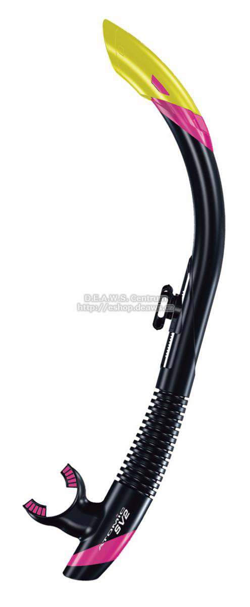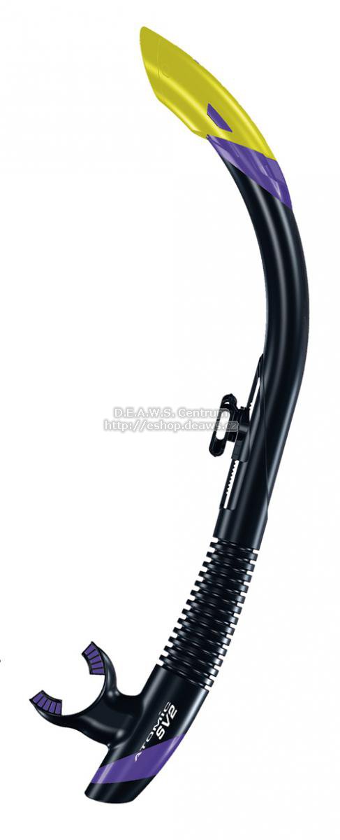 Označení SV je odvozeno od principu jednocestného ventilu "Scupper Valve", který se užívá již dlouhou dobu uspěšně na lodích. Precizní design se samozřejmou kvalitou značky AA. Silikonový ergonomický náustek. SV? Scupper Valve (Vylévací ventil)Konstrukce vylévacího ventilu na šnorchlech Aromic Aquatics je založena na stejném principu, jako jednosměrné vylévací ventily na lodích. Jestliže se vlna dostane do lodi, vylévací ventil v blízkosti hladiny na zádi jí umožní odtok, a pak se bleskově uzavře, aby nedošlo ke zpětnému nalití. Takto jednoduchý Scupper Valve udržuje palubu suchou. SV Series — jak pracuje? Popis k obrázkuStejně jednoduše jako jednosměrný odvodňovací ventil na lodi, pracuje i spodní část šnorchlů SV1 a SV2 (semi-dry), která se stará o vypuzení vody. Voda, která nateče přes vrchní část šnorchlu (1) kompletně obteče náústek a vyteče vypouštěcím ventilem (4). Jestliže je jí tolik, že se dostane do vnitřního tubusu (2) umístěného uvnitř těla šnorchlu, který je ukončen malým odvodňovacím ventilem (3) konstruovaným tak, aby voda obtekla náústek a opustila tento prostor (4) bez zbytečného hromadění v nádechovém prostoru. Potápěč jednoduše vydechne a už malý přetlak postačuje k tomu, aby vnitřní tubus zústal suchý. Je to jednoduché, je to efektivní, je to patentované! SV2 se Semi-Dry TopModel SV2 kombinuje spodní část se Scupper Valve s elegantním a efektivním polosuchým zakončením. Horizontální lamely v SV2 Semi-Dry top (1) odvádějí stříkající vodu, která by normálně natekla do trubice šnorchlu. Malé mezery mazi lamelami (2) snižují rychlost dopadající vody a zmenšují velikost kapek a následně vodu odvádí mimo (3) bez toho aby natekla do dechového prostoru. Tudíž ve vašem šnorchlu bude méně vody. Model SV2 je perfektní volnou pro rozbouřené a zvlněné vody.