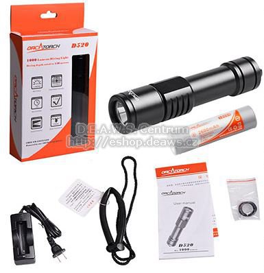 Svítilna Orca D520 je kompaktní, ale výkonná svítilna vyrobená z eloxovaného hliníku, aby byla odolná a lehká. LED CREE produkuje až 1000 lumenů bílého světla po dobu až 2 hodin s nabíjecí baterií 18650. LED dioda CREE XM-L2 (U4) produkuje čisté bílé světlo v úhlu 12 ° s 72 ° svislým světlem kolem něj, což je výhodné pro signalizaci a zaostření na jednu věc, zatímco stále osvětluje oblast kolem zaostřeného místa. Tech. data: LED Cree XM-L2 (U4), výstup max. 1000 lumenů Baterie: 1 * 18650/2 * CR123A / 2 * 16340 Mechanicky zapínání, otočením hlavy Konstrukce odolná proti tlaku vody, max. hloubka je 150 metrů Ochrana úplného vybití baterie, ochrana proti přepólování, ochrana proti výboji Hliníkový materiál Nejnovější tvrdě eloxovaná povrchová úprava diamantem - odolnost proti korozi a mořské vodě Hliníkový reflektor ze slitiny s profesionální optickou analýzou Tvrzené sklo Funkce: Výkon: 1000 lumenů Doba svícení: 2 hodiny Dosah světla, na souši: 250m Intenzita: 14300cd Odolnost proti nárazu: 1m Vodotěsnost: do 150m pod hladinou Pracovní napětí: 3 - 8.4V Rozměry: 134,5 x 30 mm / 113,5 g