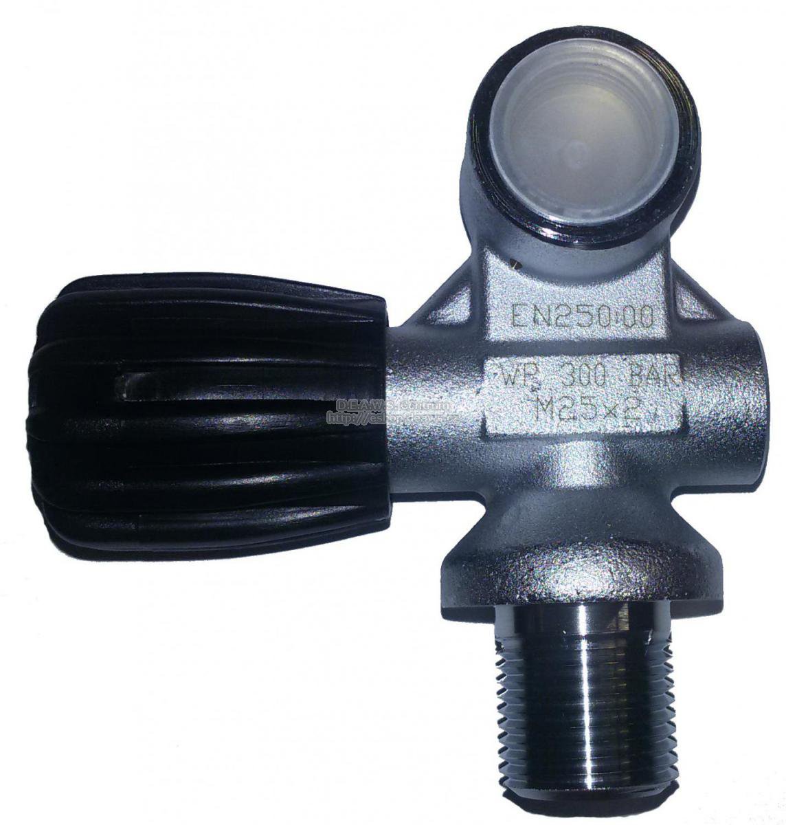 Levý mono ventil 300 bar na potápěčskou tlakovou láhev. Tech.data: Provozní tlak: 300 bar Závity do lahve: M25×2 Závit ventilů: DIN G5/8" Gumové točítko Čsté pro EANx do 40% O2