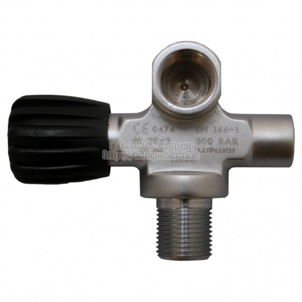 Mono ventil DIN G 5/8'' levý, pro použití s manifoldem. Bez ucpávky. Ventil je kyslíkově čistý Tech.data: Provozní tlak: 300 bar Gumové točítko Závity do láhve: M25×2