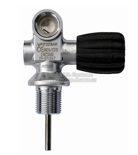 Pravý mono ventil 232 bar na potápěčskou tlakovou láhev. Tech.data: Provozní tlak: 232 bar Závity do lahve: M25×2 (součástí ventilu je o- kroužek i sací trubička) Závit ventilů: DIN G5/8" Gumové točítko Čsté pro EANx do 40% O2 Součástí balení je redukce na INT.