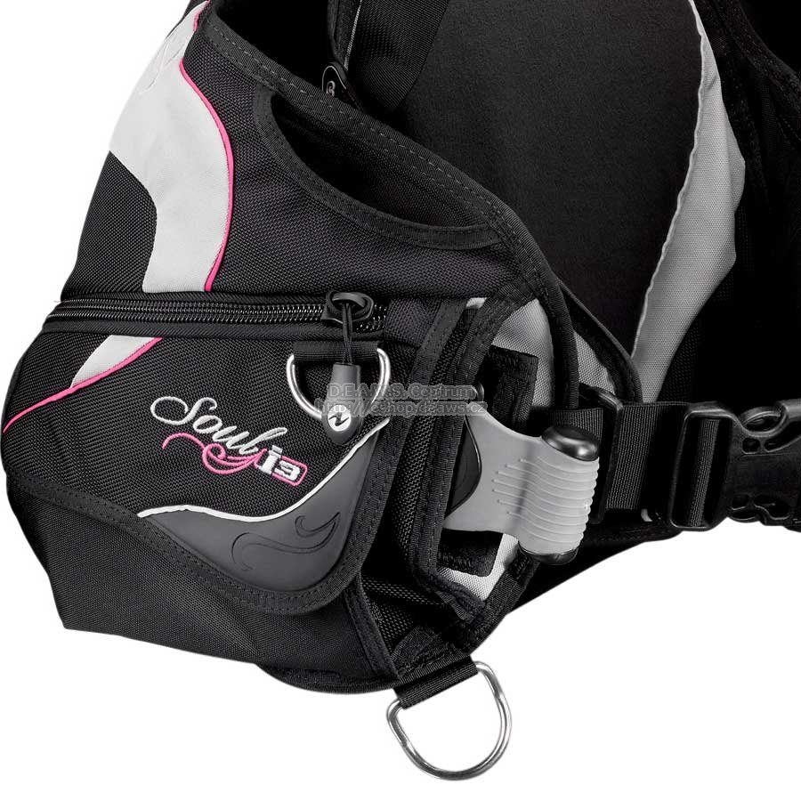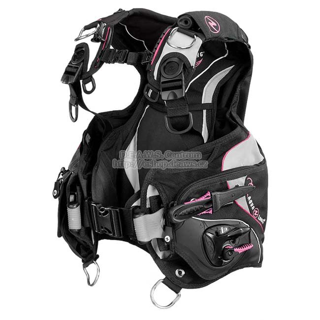 Tento luxusní dámský kompenzátor je vybaven do této chvíle nejpohodlnějším systémem postroje Wrapture. Systém napouštění i3 je zcela intuitivní - zvedněte páčku pro napuštění a stlačte pro vypuštění vzduchu. Stlačením páčky i3 se zároveň otevírají horní i dolní výpustné ventily. Ploché ventily můžou být otevřeny jak páčkou i3 tak manuálně pomocí táhla. Orální inflátor se snadno používá - stačí přitisknout rty... GripLock je uchycení lahve, které se snadno používá a je zcela bezpečné. Systém integrované zátěže SureLock II je to nejlepší co existuje - stačí vložit kapsu se zátěží dokud neuslyšíte "klik" a pro uvolnění zatáhnout za táhlo. Kapsa na octopus Octo-pocket. Velká kapsa na příslušenství na pravé straně a bezpečnostní kapsa se zipem na levé straně. Průchodky pro připevnění nože Sqeeze. Držák na manometr. 7 D-kroužků. Polstrovaný límeček pro absolutní pohodlí. Nastavitelný hrudní pásek.